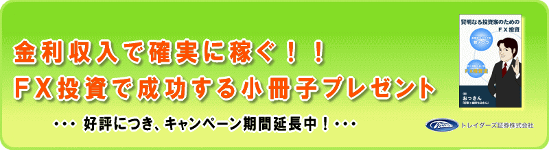 つい数年前まで、 マイナーな投資法であったFX投資が2005年あたりから盛り上がり!! 書店などでは、 たくさんのFXに関する本が並ぶようになりました。 おっさん自身も現在、 最も注目している!!投資であり、 現在までに、 ある程度の素晴らしい投資成果をあげてきております♪ 「打倒!金持ち父さん」におけるFX投資法は、 最近、本屋さんにあふれている、 ・短期的視点でのFX投資法とは異なり、 ・中長期的な視点での投資手法をメイン!に述べております。 また、小冊子の内容としては、 ・当サイトの情報を再構築&改善したものと、 ・新コンテンツを追加し、サイトには掲載されていない、マル秘!?投資手法 などを盛り込んだ内容となっています♪ ですから!! この小冊子をご覧になれば、 おっさんと同じだけ、いや!!それ以上に稼げるはず?!であります。(笑) 頑固な投資方針に則った!長期投資を淡々と!行うことで、 着々と!!『金持ちへの道』へ進んでいくこと間違いなし!!です♪ 皆様、経済的自由を目指し、どうぞご一緒に!!がんばっていきましょう♪ 最後に!! トレイダーズ証券は、 以前から、当サイトでご紹介しているように、 『信用力』、『サービス』、『手数料』などの視点からみて、おっさんのオススメの会社です♪ 是非、この機会に! トレイダーズ証券で口座を開設し、小冊子をご覧になってください♪ そうすれば、 FX投資のさらなる魅力をご理解頂けると思います!! ![]()